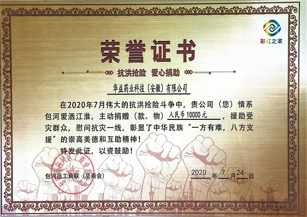在2020年7月,江淮大地抗洪搶險(xiǎn)斗爭(zhēng)中,華益藥業(yè)不忘初心,積極投身抗洪一線,關(guān)愛受災(zāi)群眾,情系江淮,愛灑包河,捐贈(zèng)人民幣壹萬(wàn)元整,為災(zāi)區(qū)重建盡綿薄之力。
