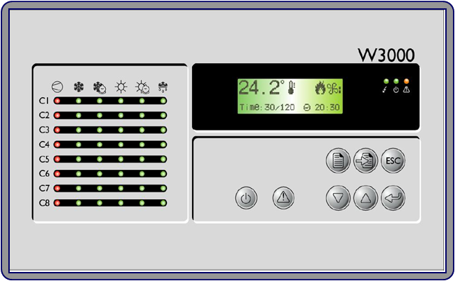 2. 機(jī)組控制與運(yùn)行管理:先進(jìn)的W3000 微電腦智能控制系統(tǒng),內(nèi)置克萊門特特殊設(shè)計(jì)的控制算法,更加突出機(jī)組的節(jié)能性和可靠性:FIFO 壓縮機(jī)運(yùn)行時(shí)間均衡功能,延長(zhǎng)整機(jī)壽命;自動(dòng)負(fù)荷調(diào)整輸出功能,節(jié)能節(jié)電;通過(guò)與壓縮機(jī)的減載系統(tǒng)相配合,實(shí)現(xiàn)25-100%無(wú)級(jí)調(diào)節(jié);運(yùn)行參數(shù)調(diào)整和設(shè)定,適應(yīng)不同環(huán)境應(yīng)用;溫度壓力保護(hù)采用模擬量測(cè)量,可以預(yù)測(cè)預(yù)防故障發(fā)生,增加可靠性。